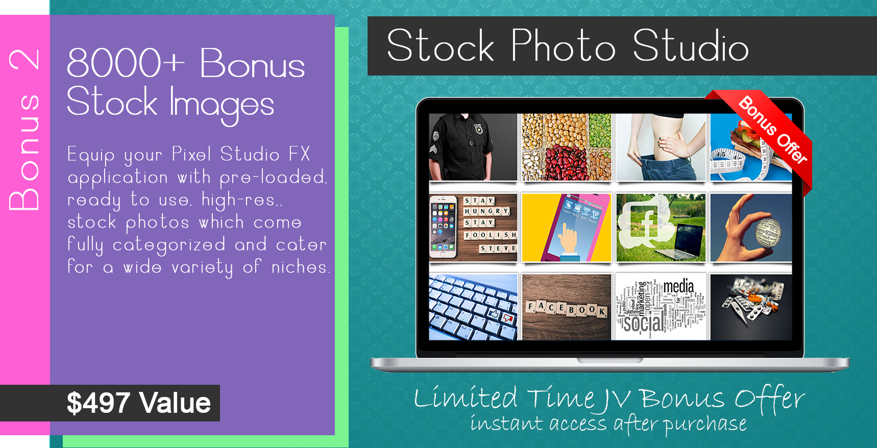 The Stock Photo Studio activates your Pixel Studio FX Library of over 8000 high resolution stock images and photographs selected from a wide range of artists, covering multiple niches and industries to give you the most expansive and unique variety bundles with your Pixel Studio FX Application.