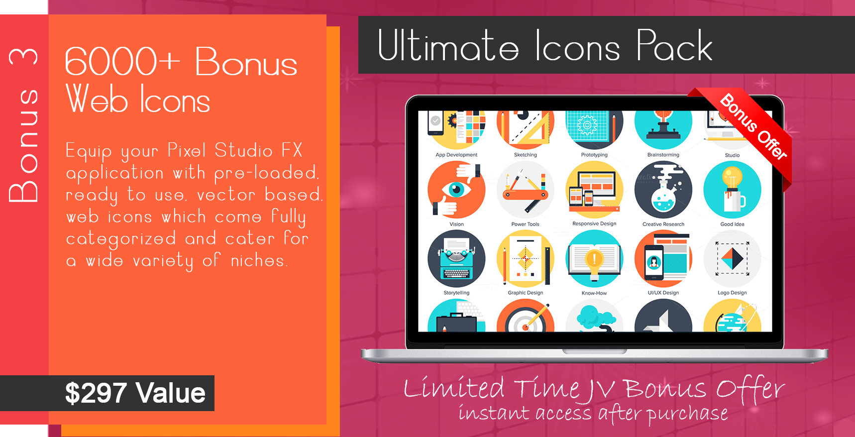 The Ultimate Icons Pack comes packed with 6000+ bonus web icons from a wide variety of niches for use with Pixel Studio FX. The icons are png vectors which will allow the use of colour actions in the application to completely customise each icon to your liking. These icons are designed by top rated designers from across the globe.